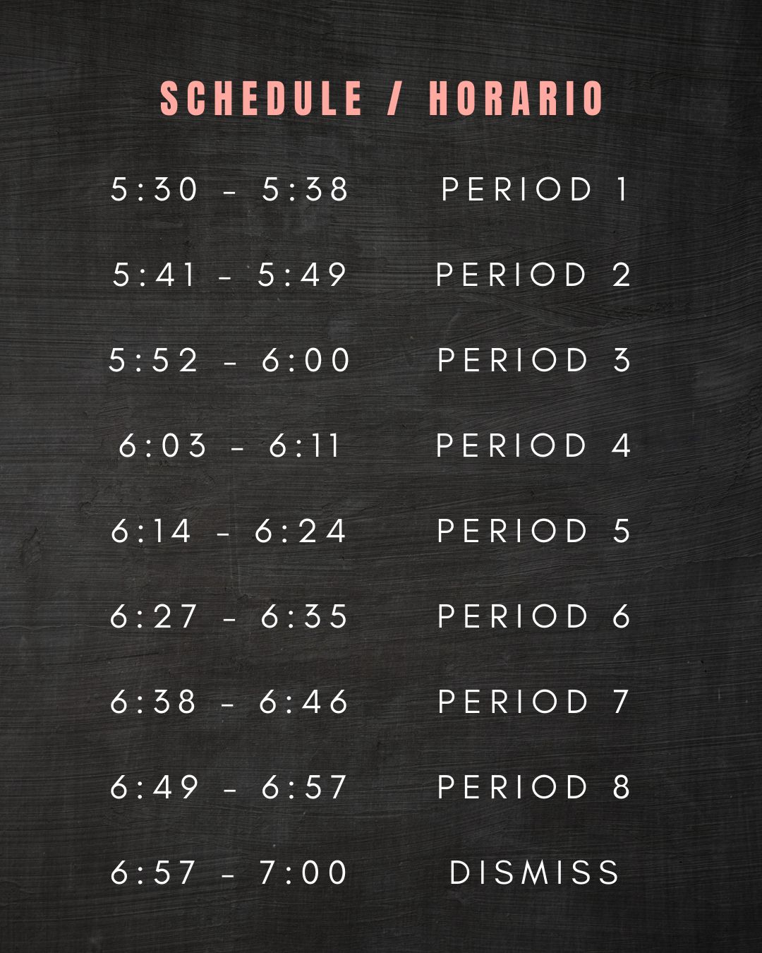 Each period is 8 minutes long with transitions between (see full schedule below)